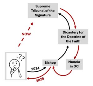 Within the last several weeks, some of the persons received letters either from their bishop, chancellor, or vicar general. Each letter was similar, saying that the Dicastery of the Doctrine of the Faith instructed the US Papal Nuncio to instruct the bishop that the Dicastery says the matter is closed. Additionally, the Nuncio says that it was instructed to forward no more letters to the Dicastery on behalf of the person making recourse. This is weird because canon law itself requires that an aggrieved appellant must ask a Dicastery to change its mind prior to appealing to the Signatura. It is also unusual because the US Papal Nuncio regularly forwards appeals to Rome Tribunals and Dicasteries for US residents. When someone brings a canon law action to a Rome Tribunal or Dicastery (via the Nuncio), the Nuncio sends a confirmation letter and assigns a record number, and this serves as proof of delivery. But in this matter, the Nuncio is telling the bishops that he is not allowed to forward anything more to the Dicastery.